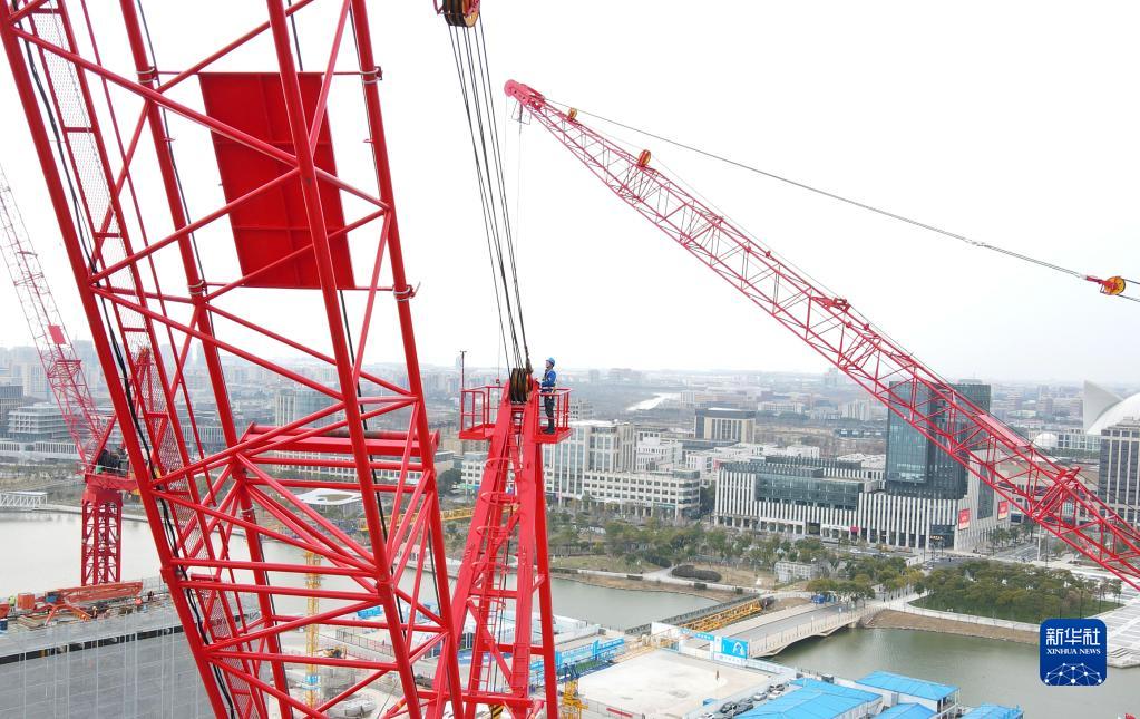2月17日,在位于中國(上海)自由貿易試驗區臨港新片區的中建二局臨港西島中銀金融中心項目工地,一名智能造樓機動(dòng)力臂駕駛員在進(jìn)行鋼纜安全例行檢查(無(wú)人機照片)。