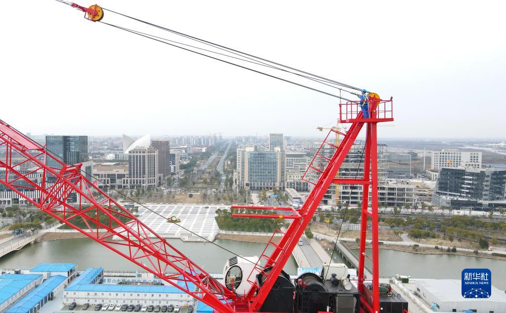 2月17日,在位于中國(上海)自由貿易試驗區臨港新片區的中建二局臨港西島中銀金融中心項目工地,一名智能造樓機動(dòng)力臂駕駛員在進(jìn)行鋼纜安全例行檢查(無(wú)人機照片)。