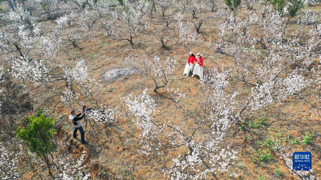 2月17日,游人在貴州省黔西南布依族苗族自治州安龍縣普坪鎮一處櫻桃基地賞花(無(wú)人機照片)。