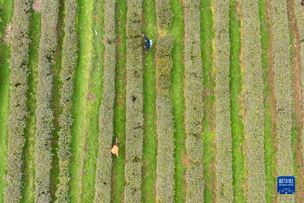 2月17日,茶農在湖北省丹江口市土關(guān)埡村武當茶谷勞作(無(wú)人機照片)。