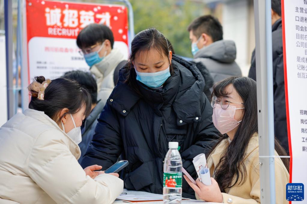 2月17日,在中國成都人力資源服務(wù)產(chǎn)業(yè)園,求職者(前右)與招聘企業(yè)工作人員交流。