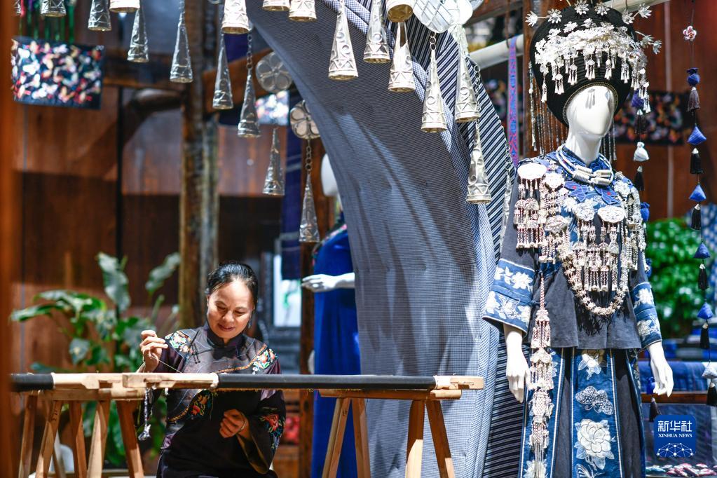 石麗平在貴州省銅仁市展示苗繡技藝(2021年9月26日攝)。新華社記者 楊文斌 攝