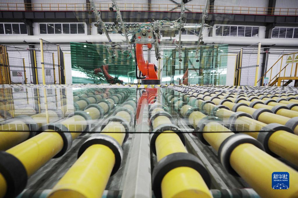 2月17日,在中建材佳星玻璃(黑龍江)有限公司車(chē)間內,智能生產(chǎn)線(xiàn)上的機械臂在作業(yè)。