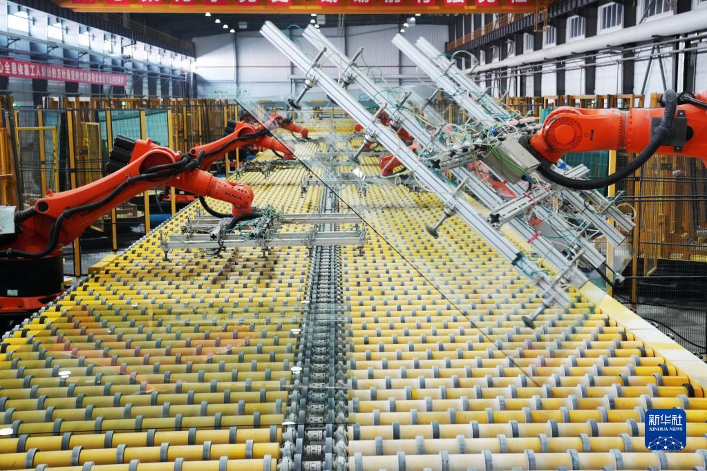 2月17日,在中建材佳星玻璃(黑龍江)有限公司車(chē)間內,智能生產(chǎn)線(xiàn)上的機械臂在作業(yè)。