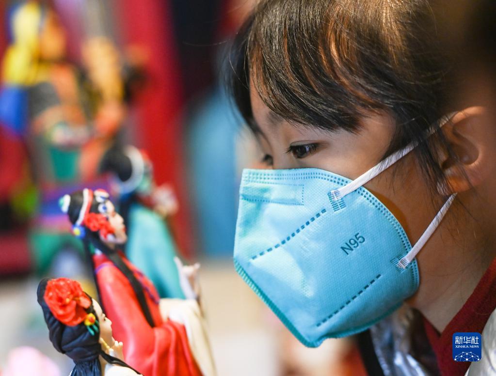 一位小游客在非遺大集上的曹州面人攤位前駐足(2月17日攝)。