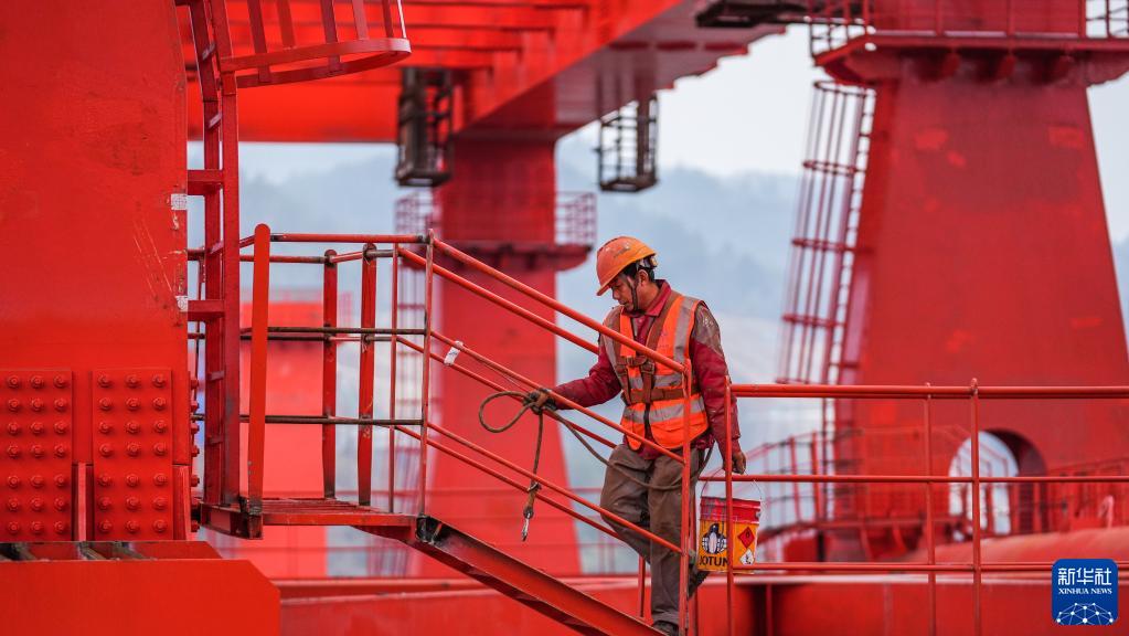 中交一公局工人在德余高速烏江特大橋橋梁上行走,前往施工點(diǎn)(2月16日攝)。
