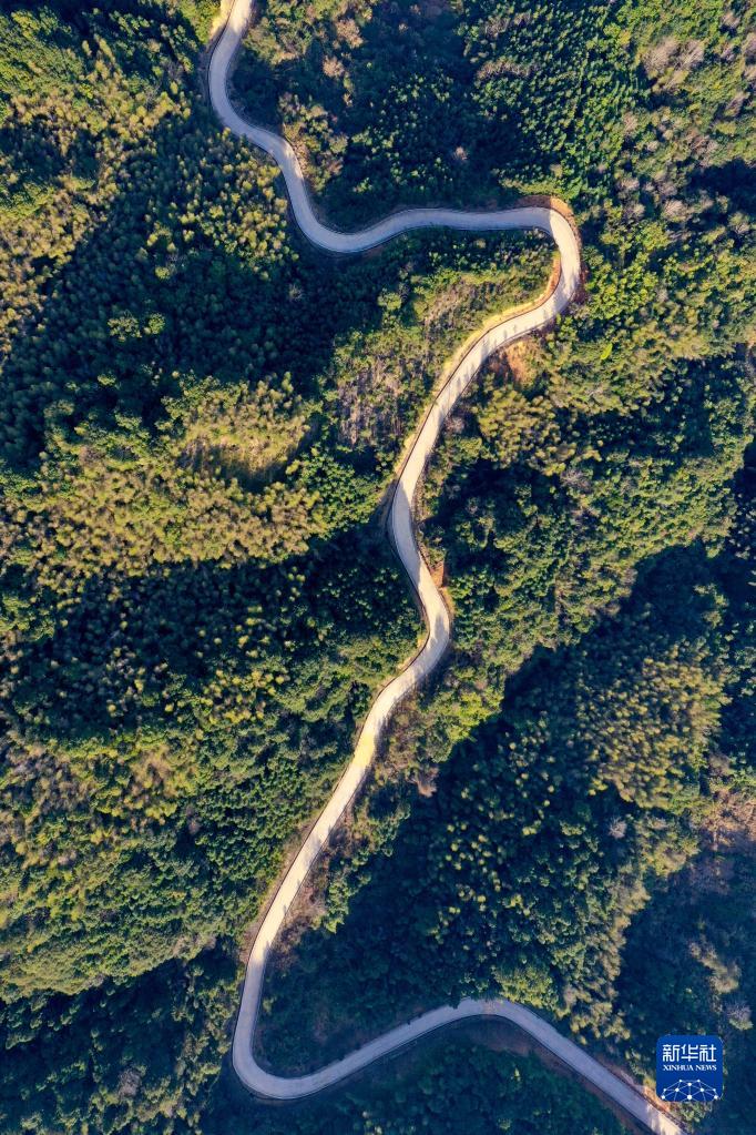 2月16日拍攝的通往小滄畬族鄉七里村的盤(pán)山公路(無(wú)人機照片)。