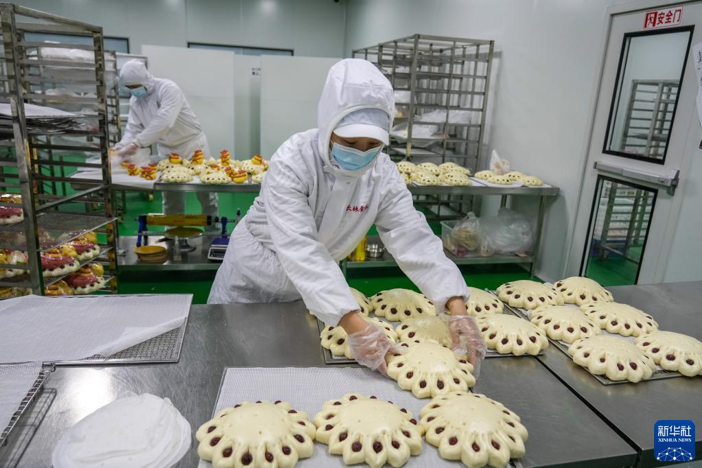 2月17日,威海長(cháng)林生態(tài)農業(yè)有限公司員工在十萬(wàn)級凈化生產(chǎn)車(chē)間內制作花餑餑。