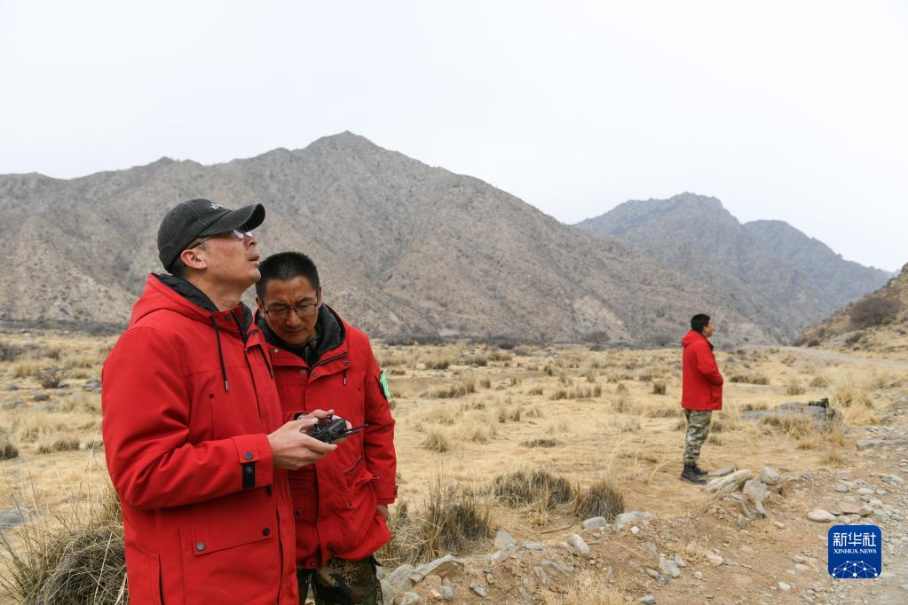 2月17日,哈拉烏管理站管護員達來(lái)(左)利用無(wú)人機開(kāi)展巡護。