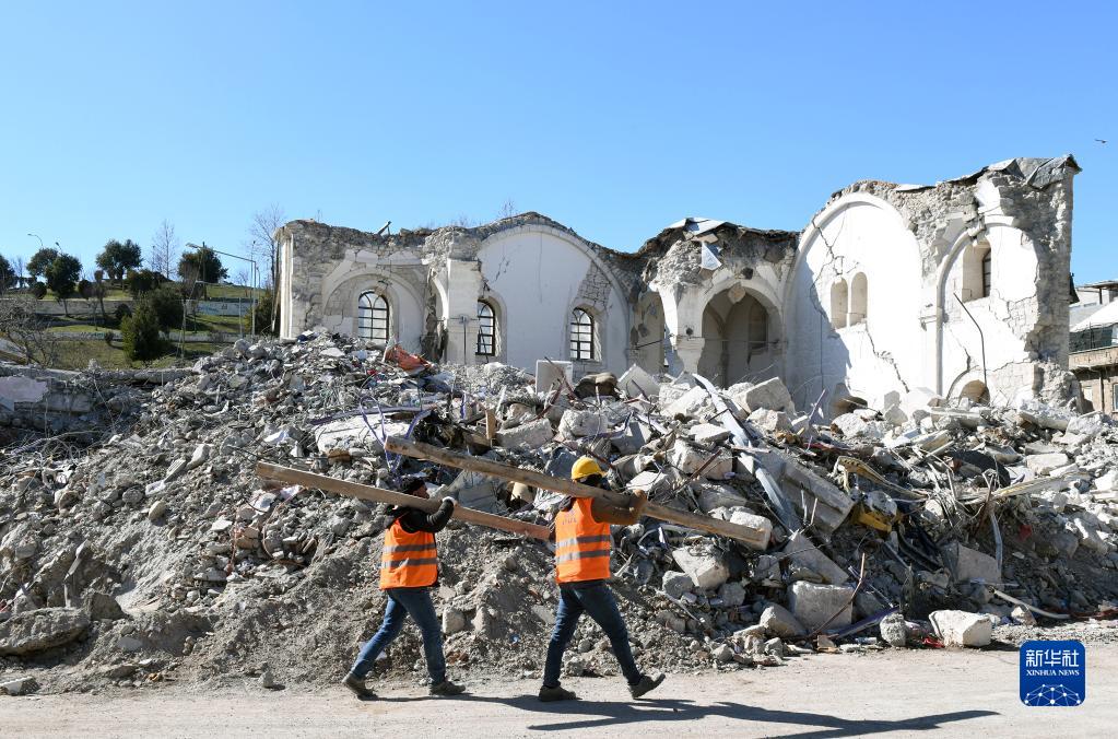 2月18日,在土耳其南部阿德亞曼省阿德亞曼市,工作人員走過(guò)一處建筑物廢墟。