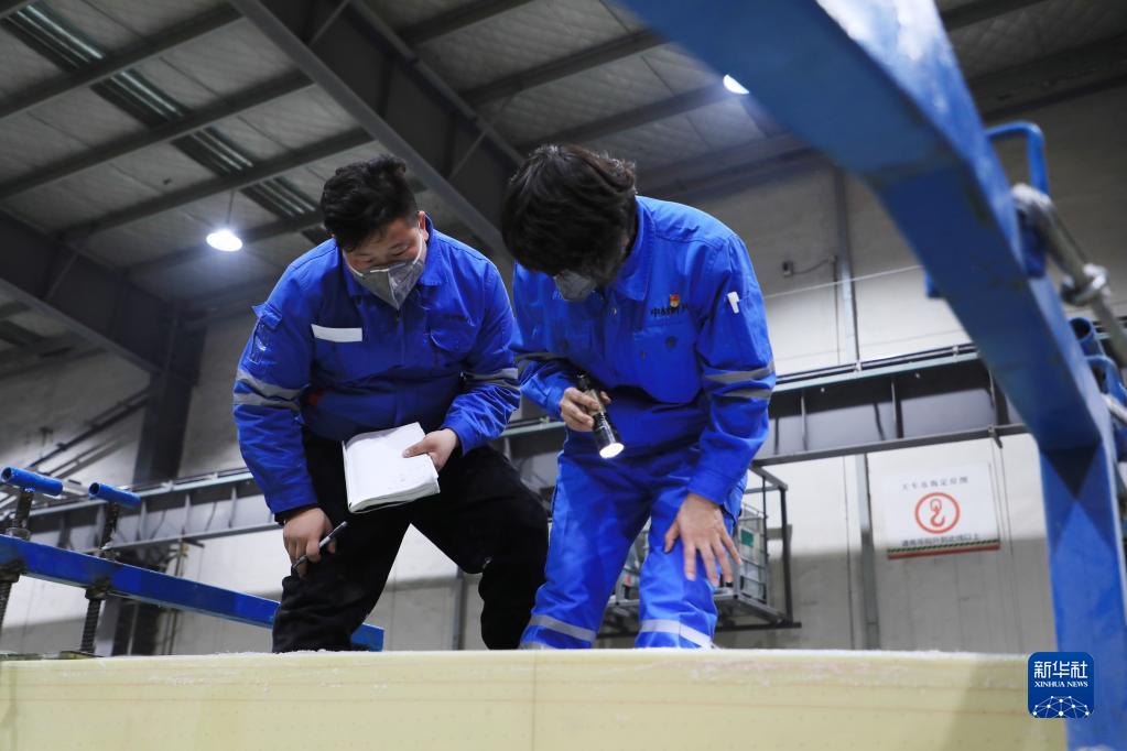 2月17日,在酒泉經(jīng)濟技術(shù)開(kāi)發(fā)區的一家風(fēng)電葉片制造企業(yè),工人在風(fēng)機葉片生產(chǎn)線(xiàn)檢查生產(chǎn)情況。