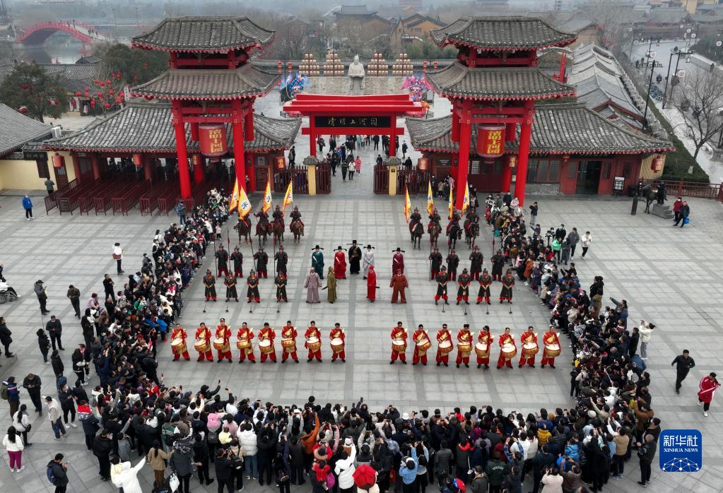 2月18日,游客在開(kāi)封清明上河園景區觀(guān)看民俗表演(無(wú)人機照片)。