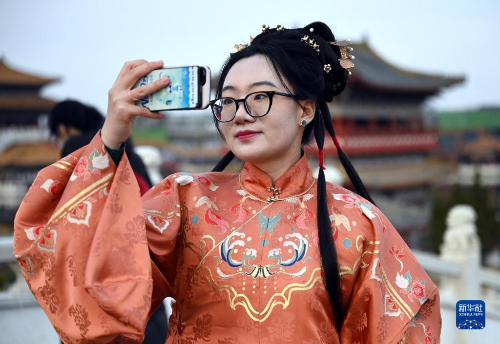 一名穿著(zhù)傳統服飾的游客在開(kāi)封清明上河園景區內自拍(2月14日攝)。