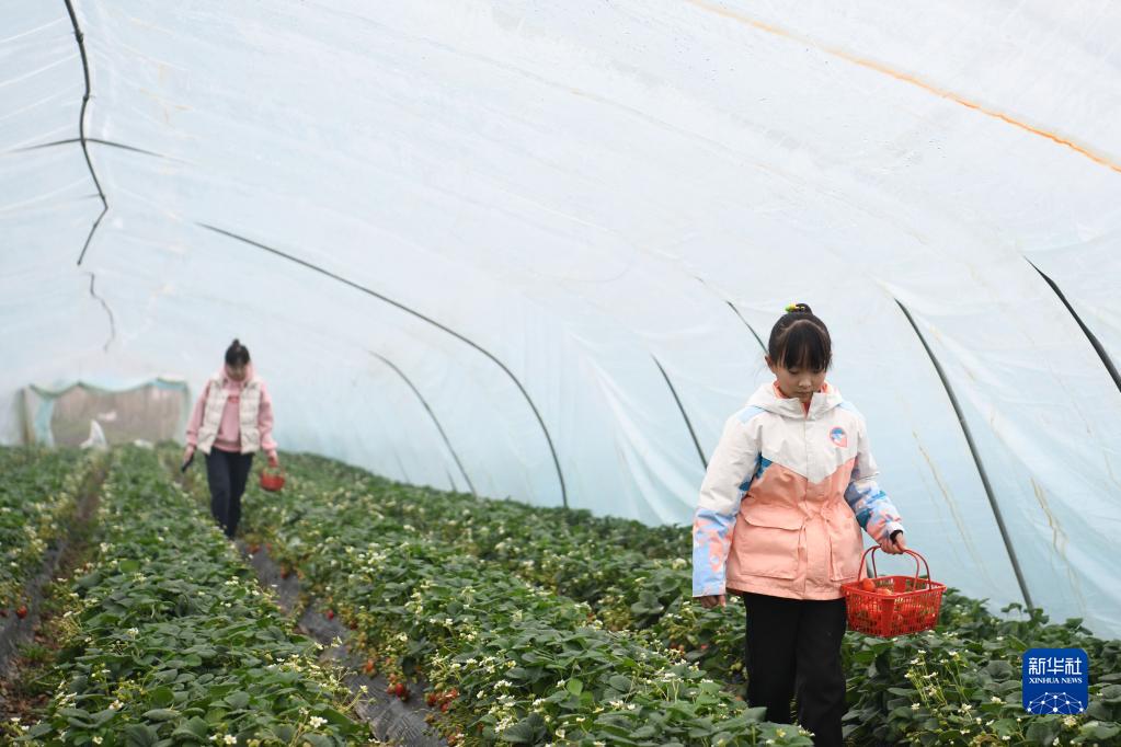 2月18日,孩子和家長(cháng)(左)在馬郢社區采摘草莓。