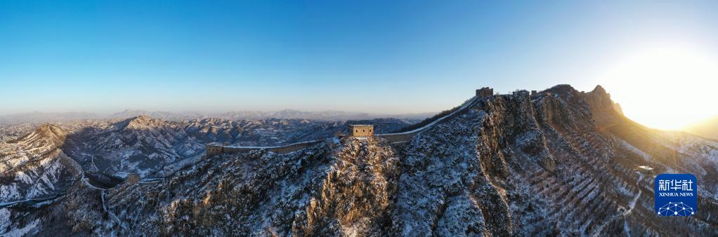 這是2月19日在晨曦中拍攝的雪后司馬臺長(cháng)城(無(wú)人機全景照片)。