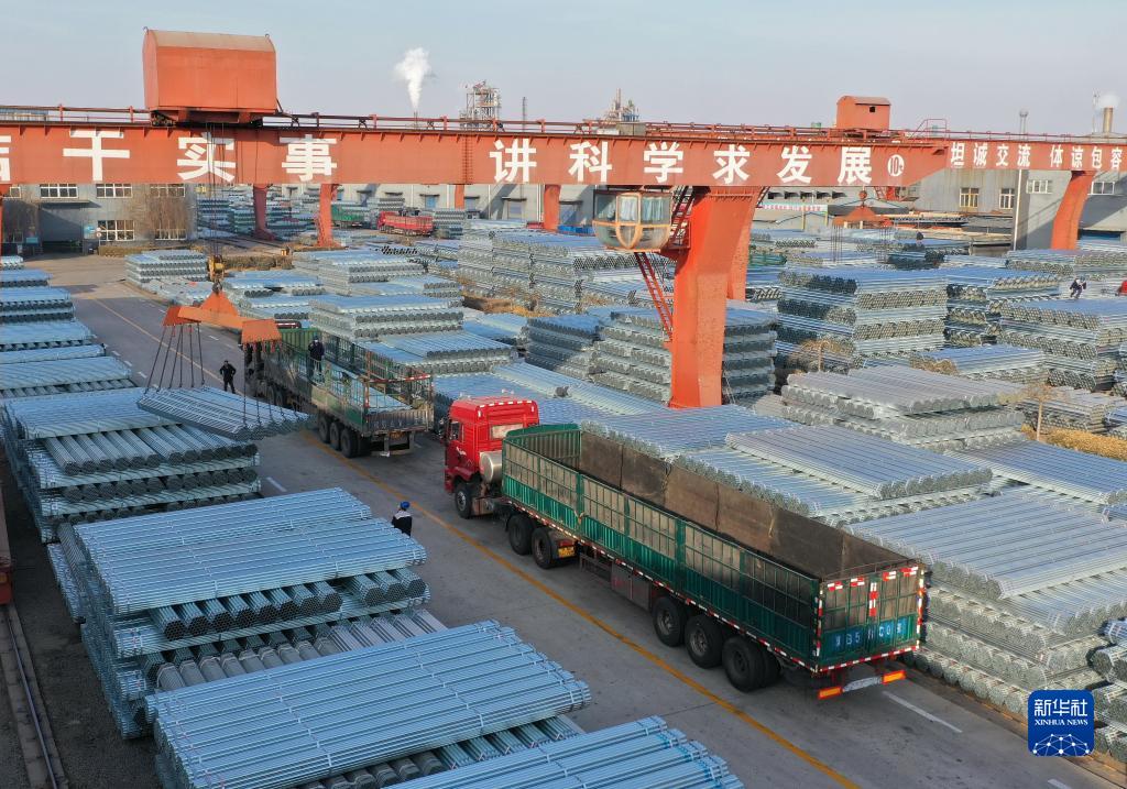 2月19日,工人在唐山市豐南區一家鍍鋅鋼管企業(yè)倉儲區操作設備吊裝鍍鋅鋼管(無(wú)人機照片)。