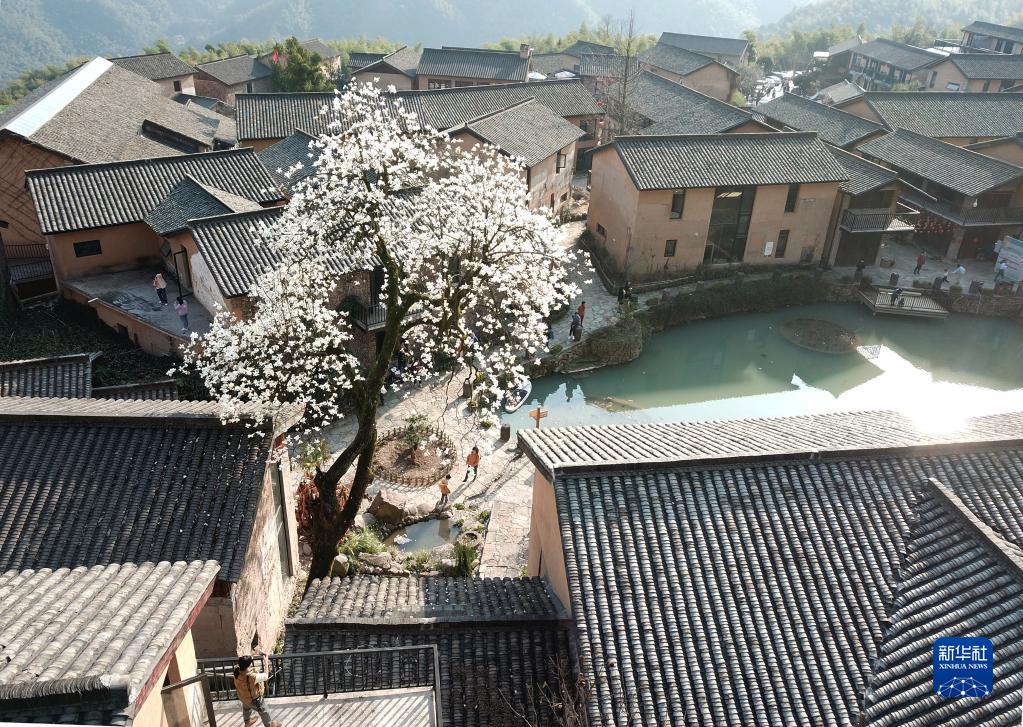 2月18日,游客在浙江省義烏市楊盆村的白玉蘭樹(shù)下游玩賞花。