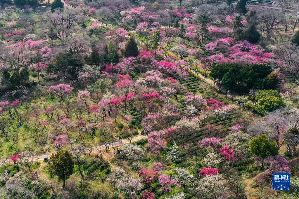2月19日,游客在江蘇南京梅花山賞花游玩(無(wú)人機照片)。