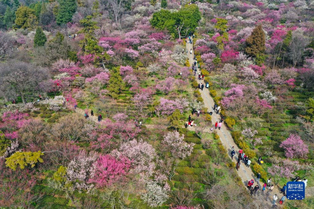 2月19日,游客在江蘇南京梅花山賞花游玩(無(wú)人機照片)。