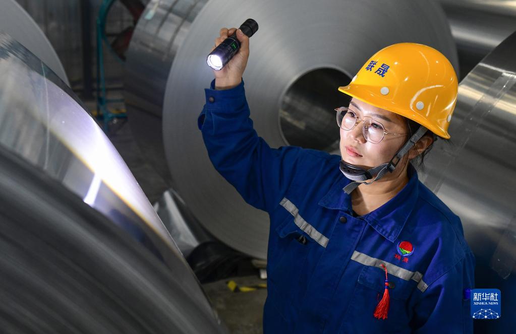 2月19日,在霍林郭勒市一家鋁業(yè)公司,質(zhì)檢員在檢查鋁箔產(chǎn)品質(zhì)量。