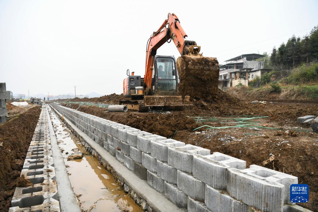 2月19日,施工人員在常寧市三角塘鎮塘沖村高標準農田建設現場(chǎng)修建排水渠。