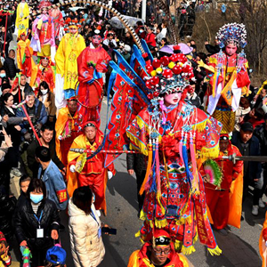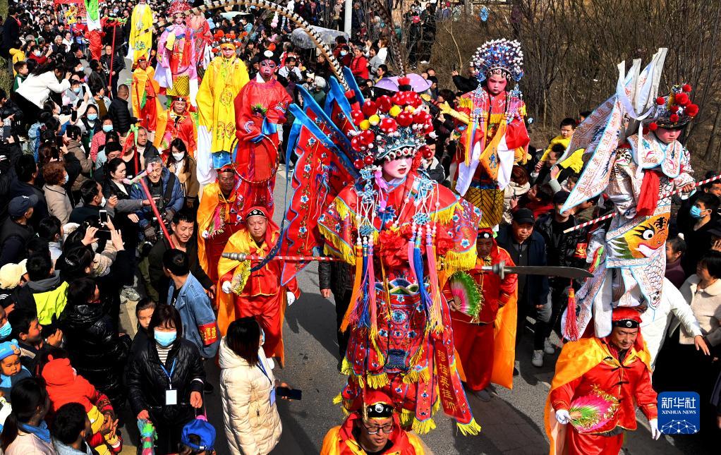 當日是農歷正月二十九,陜西省西安市臨潼區櫟陽(yáng)街道卷子村舉行“背芯子”表演,吸引了許多群眾前來(lái)觀(guān)看?!氨承咀印笔侵袊耖g社火表演的一種,背桿用特制的鐵架子綁在背者身上,上端站有四五歲的兒童,按照故事內容扮成不同的人物。背者加上上端兒童高達三米多,隨著(zhù)鼓點(diǎn)踏著(zhù)碎步進(jìn)行表演。
