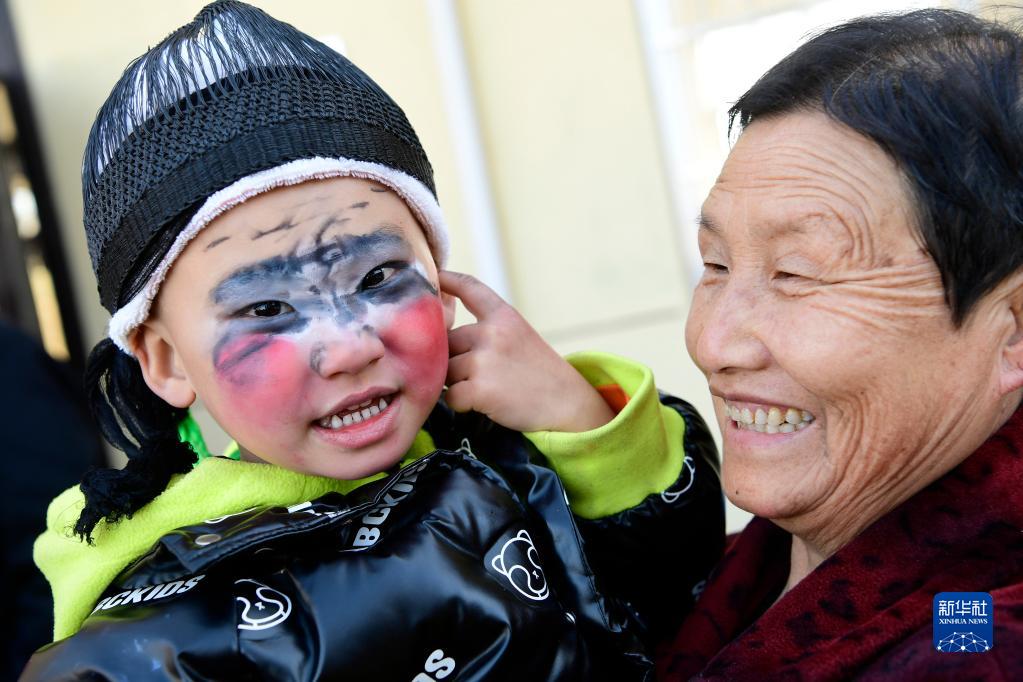 2月19日,西安市臨潼區櫟陽(yáng)街道卷子村參加“背芯子”表演的小朋友向奶奶展示自己的妝扮。