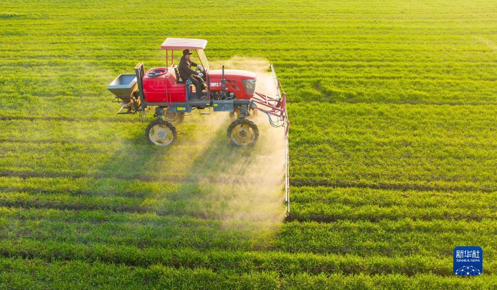 2月19日,在江蘇省海安市隆政街道林橋村,村民駕駛植保機械在小麥田間噴灑藥物(無(wú)人機照片)。