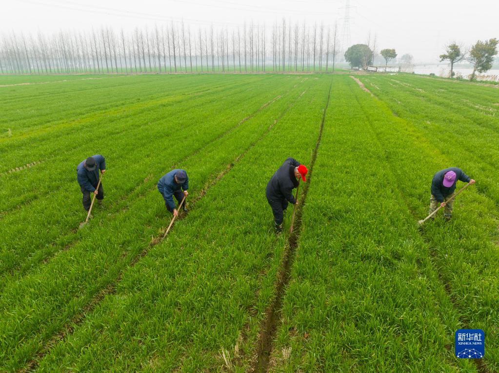 2月19日,村民在江蘇省昆山市錦溪鎮長(cháng)云村南農場(chǎng)小麥田清理水溝(無(wú)人機照片)。