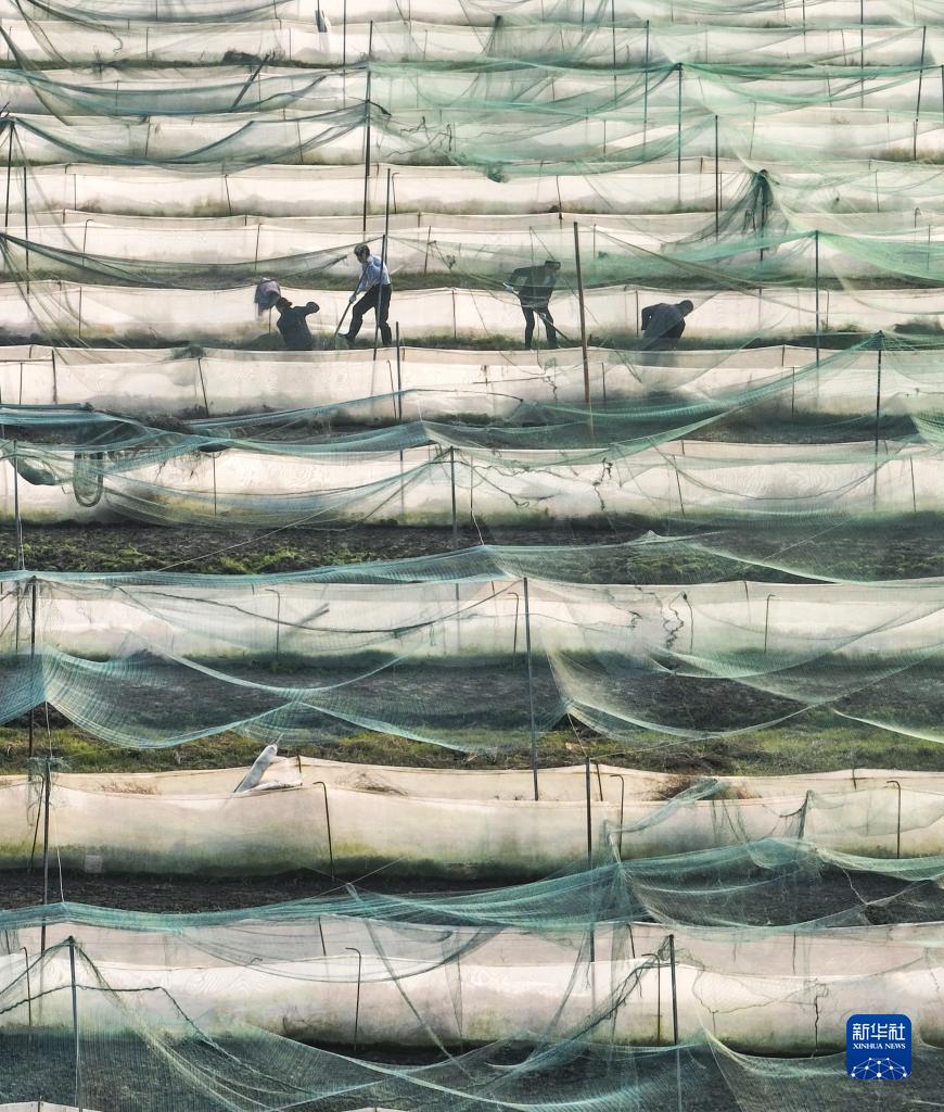 2月20日,在湖南省永州市道縣清塘鎮陳熊村稻蛙基地,村民在清理雜草(無(wú)人機照片)。