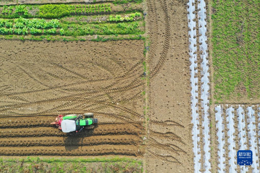 2月20日,湖南省永州市道縣祥霖鋪鎮下蔣村村民在翻耕土地,準備種玉米(無(wú)人機照片)。