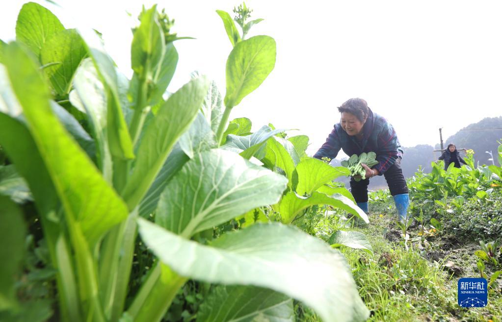 2月20日,湖南省衡陽(yáng)市衡山縣開(kāi)云鎮世上村村民在地里采收甜菜心。