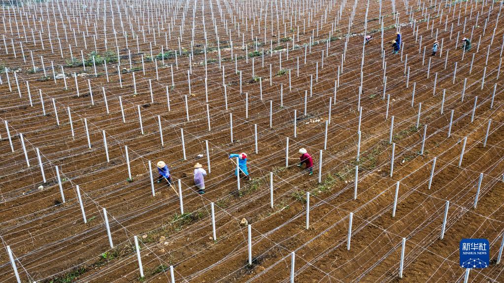2月19日,農民在廣西靖西市龍臨鎮龍明村百香果種植基地勞作(無(wú)人機照片)。