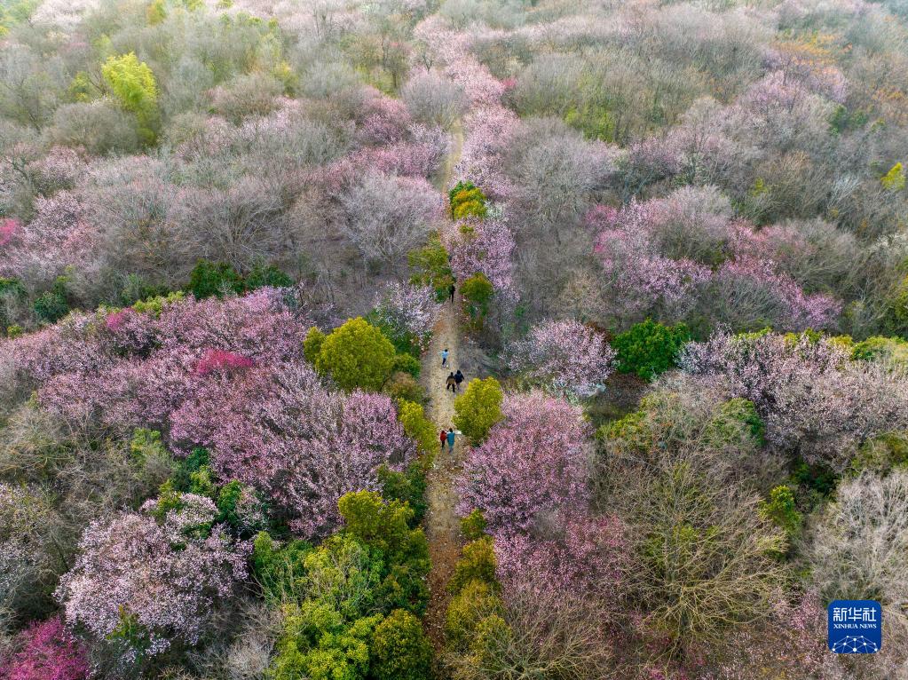 2月19日,人們在安徽合肥市肥東縣長(cháng)臨河鎮巢香梅園內欣賞盛開(kāi)的梅花(無(wú)人機照片)。
