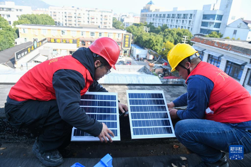 2月20日,在余姚市古建小區屋頂,余姚市大城小愛(ài)公益服務(wù)中心的志愿者在安裝光伏發(fā)電板。