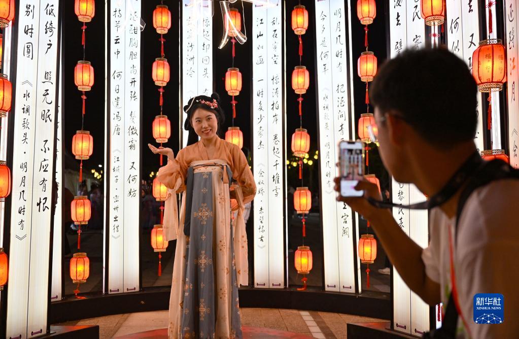 游客在??谌赵聫V場(chǎng)的古風(fēng)市集拍照留念(2月19日攝)。