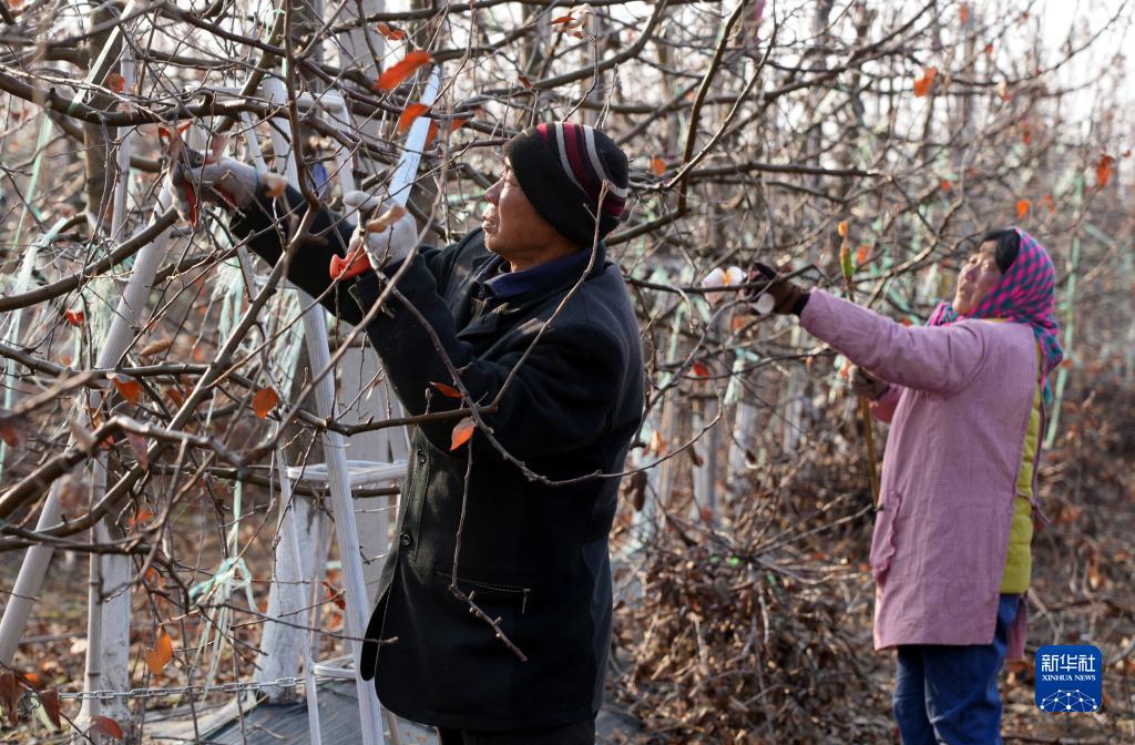 2月19日,在夏莊鎮甲夼區域鄉村振興共富黨建聯(lián)盟一處現代化蘋(píng)果產(chǎn)業(yè)基地內,村民在進(jìn)行果樹(shù)修枝作業(yè)。