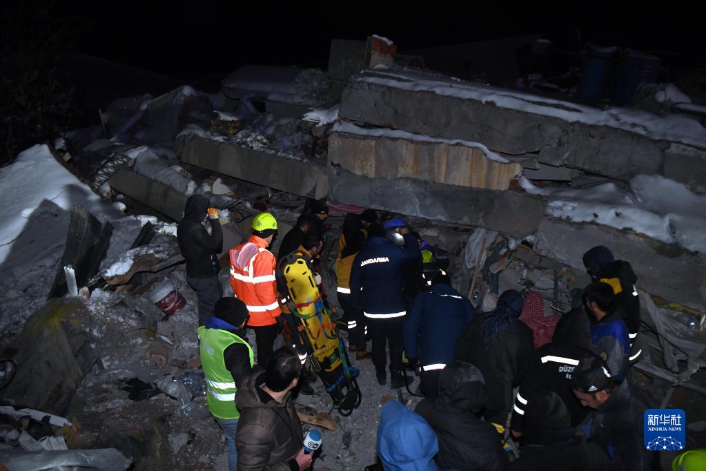 2月7日,救援人員在土耳其卡赫拉曼馬拉什省南部的埃爾比斯坦地區開(kāi)展地震救援工作。