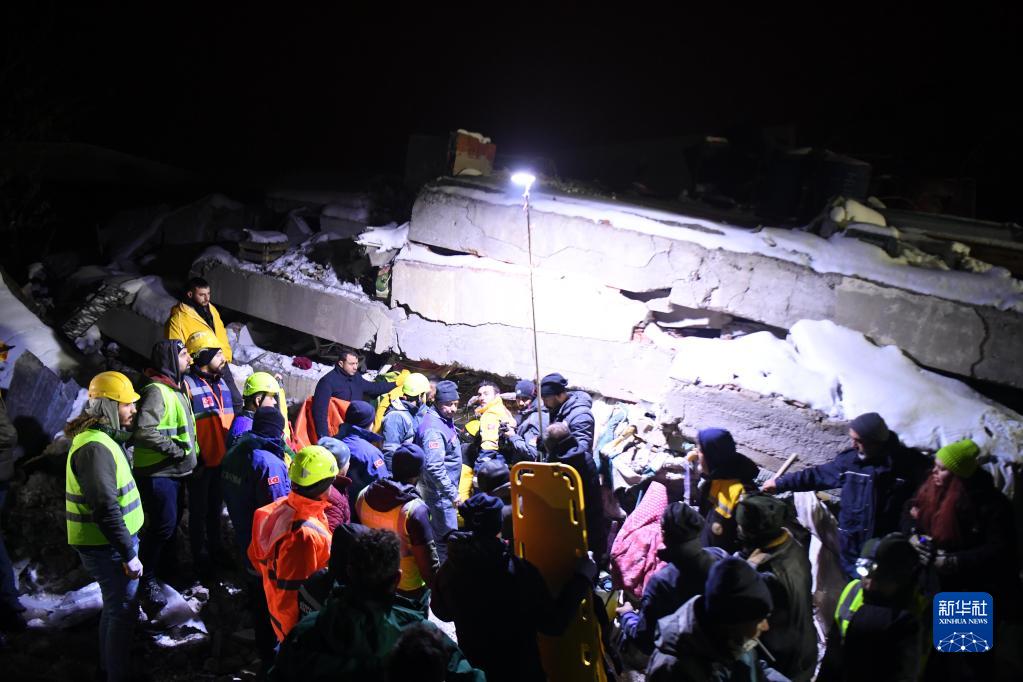 2月7日,救援人員在土耳其卡赫拉曼馬拉什省南部的埃爾比斯坦地區開(kāi)展地震救援工作。