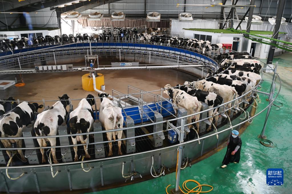 在武威市古浪縣生態(tài)奶牛產(chǎn)業(yè)園的一家企業(yè)牧場(chǎng),工作人員在轉盤(pán)式擠奶機旁工作(2月16日攝)。