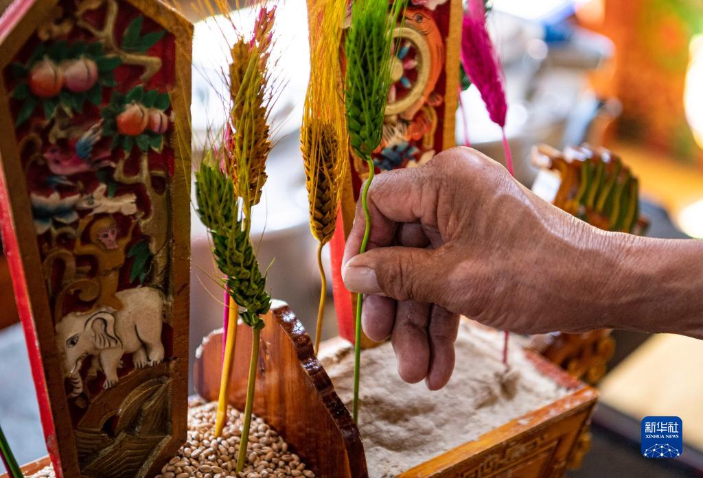 2月20日,在位于西藏拉薩市墨竹工卡縣門(mén)巴鄉的家中,扎西次仁用五彩青稞穗裝點(diǎn)象征吉祥的“切瑪”。