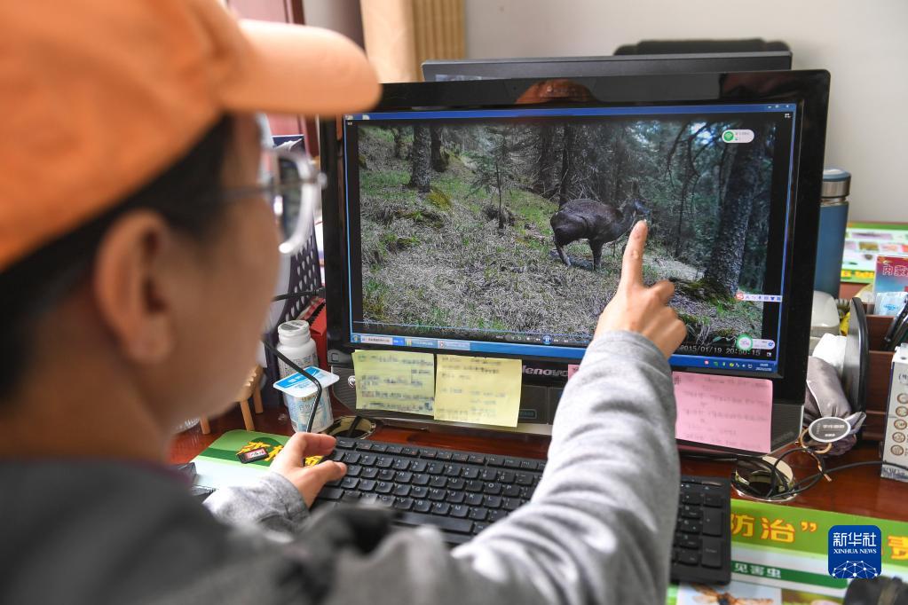 2月20日,在內蒙古賀蘭山國家級自然保護區管理局,工作人員阿麗瑪展示紅外相機拍攝到的國家一級保護動(dòng)物馬麝。