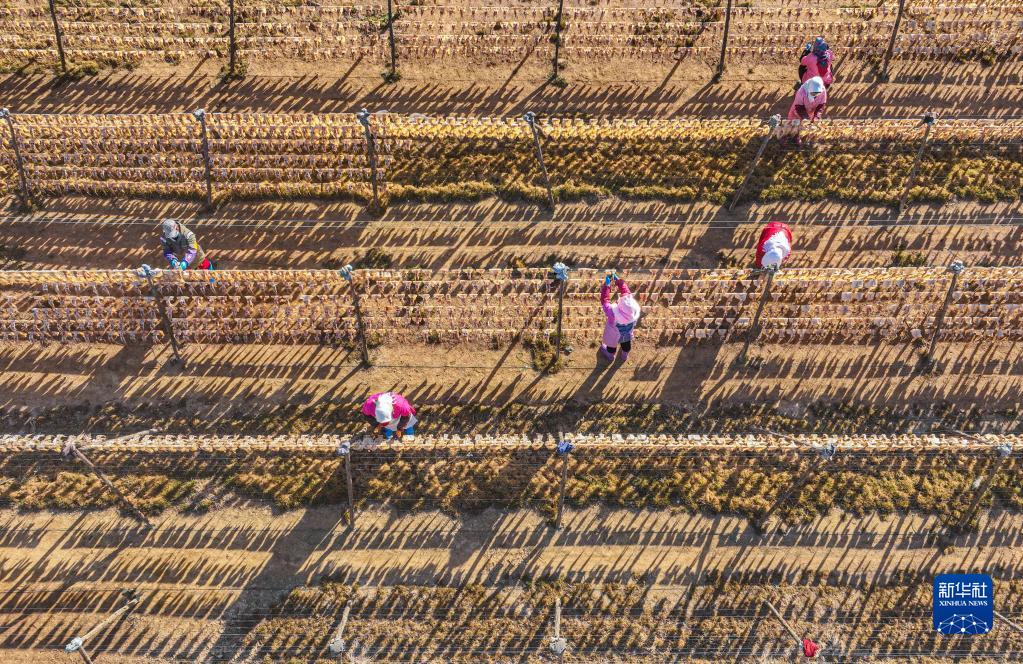 2月20日,在榮成市靖海灣畔一處晾曬場(chǎng),漁民在晾曬魷魚(yú)(無(wú)人機照片)。