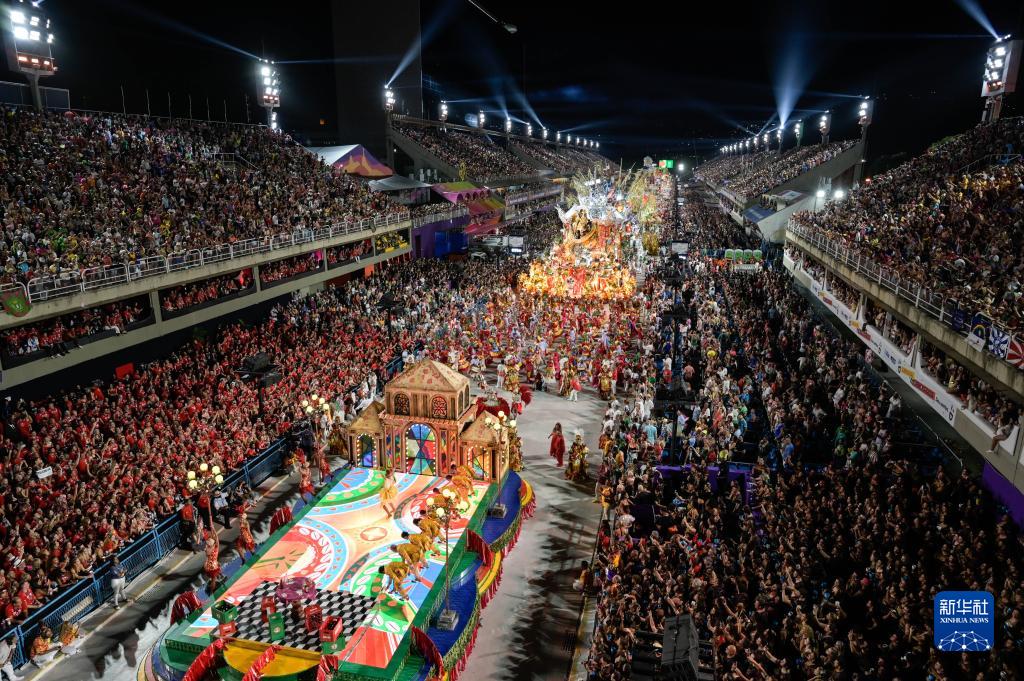 2月19日晚,在巴西里約熱內盧的桑巴大道,一輛桑巴舞?;ㄜ?chē)參加狂歡節游行。