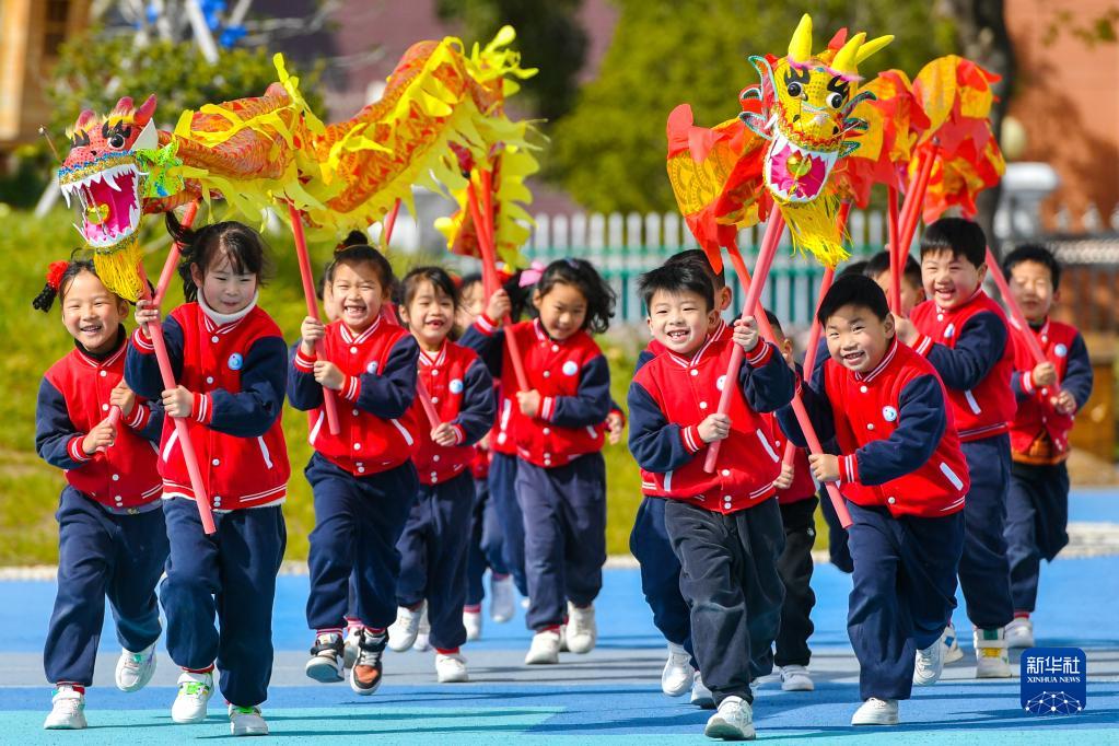 2月21日,浙江省湖州市長(cháng)興縣夾浦鎮中心幼兒園的孩子們體驗舞龍。