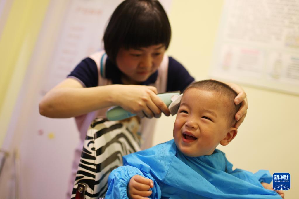 2月21日,江蘇南京一家嬰幼兒理發(fā)店的工作人員給小朋友理發(fā)。