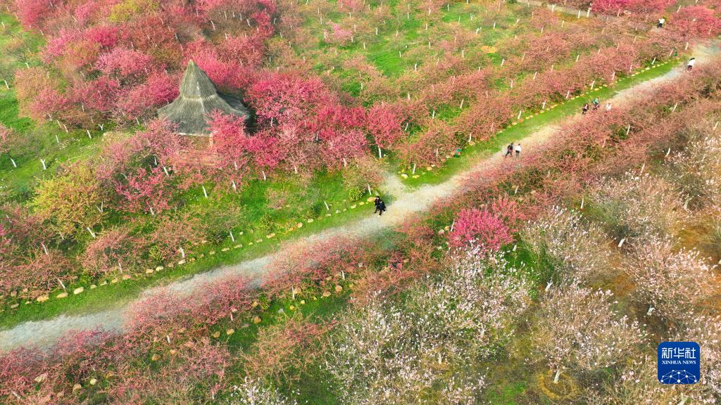 2月20日,游客在常寧市羅橋鎮廟山村櫻花園賞櫻游玩(無(wú)人機照片)。