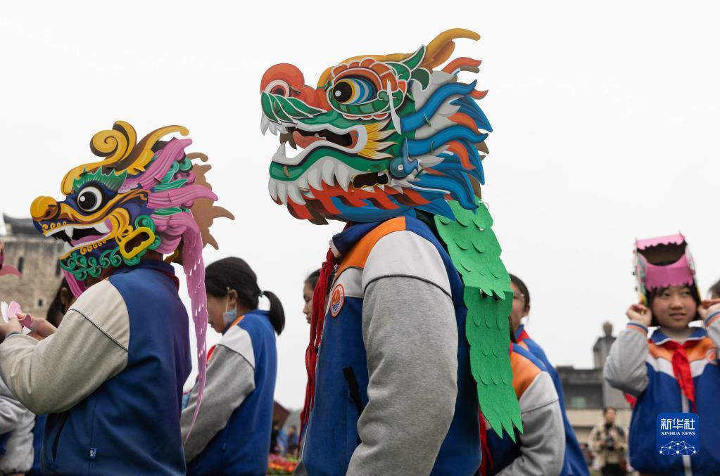 2月21日,在瀘縣屈氏莊園,瀘縣方洞小學(xué)的學(xué)生們頭戴“紙龍”觀(guān)看舞龍表演。