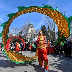 2月21日,在天津市水上公園,民間藝人表演空竹舞龍。