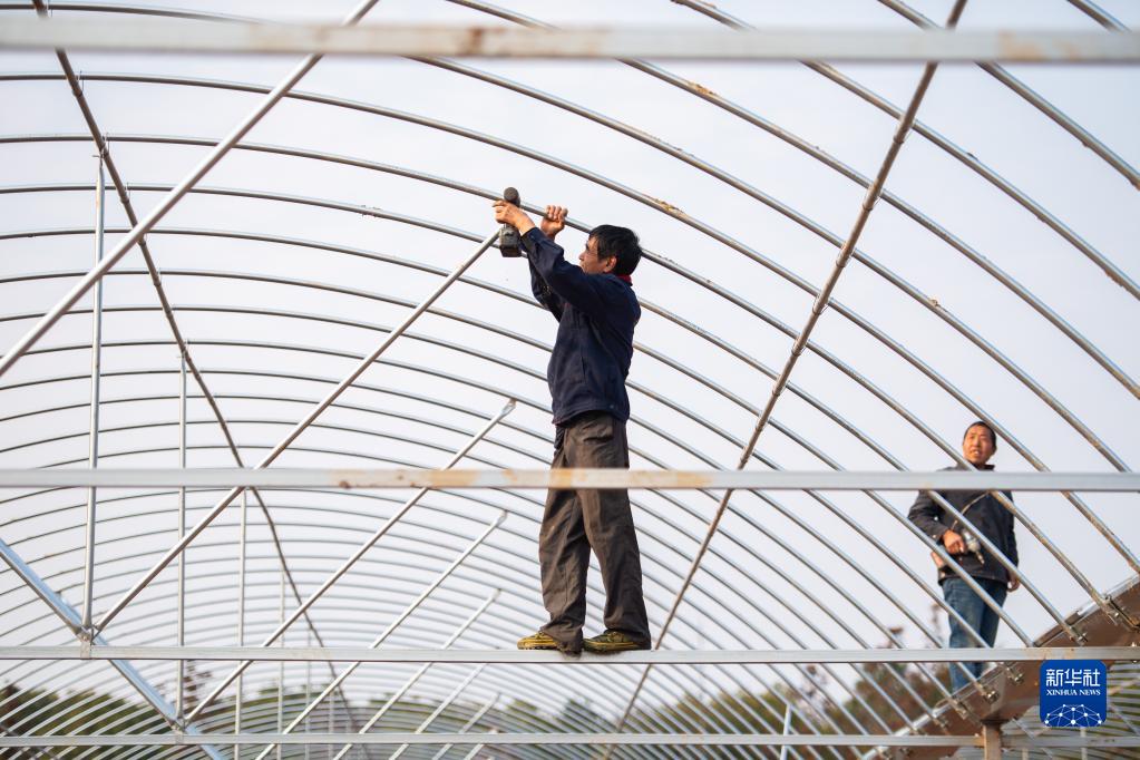 2月21日,在醴陵市東富鎮東富村,村民在搭建育秧大棚。